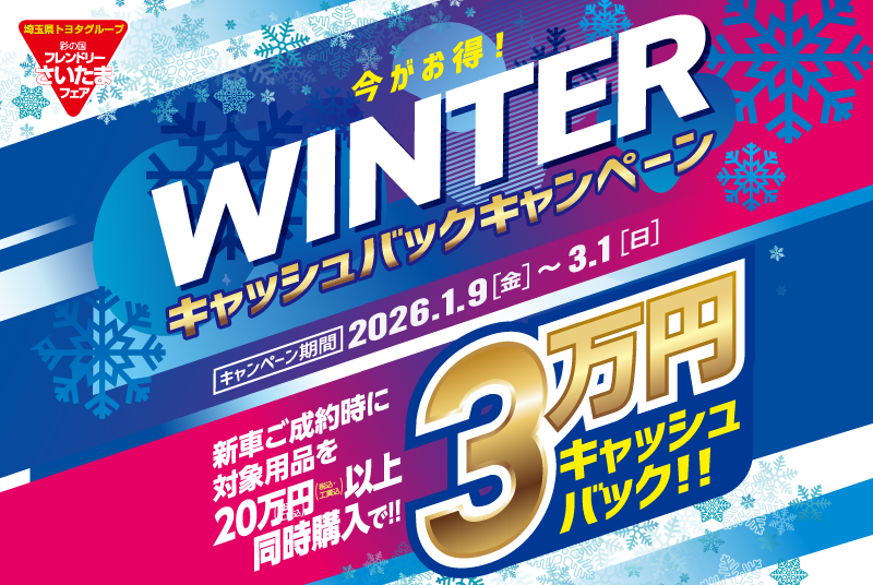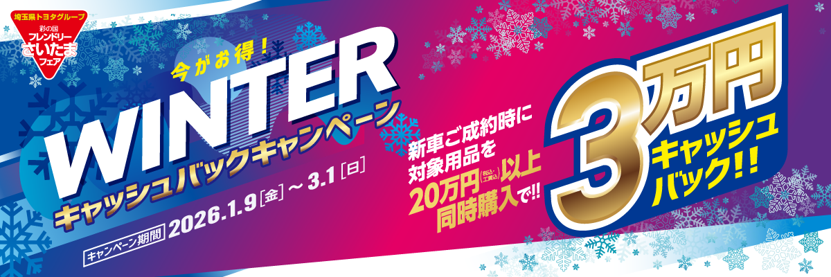 トヨタ全車種(軽自動車・商用車をのぞく)ご成約時に対象用品を同時購入で3万円キャッシュバック! 期間限定のお得なキャンペーンを実施中です! 3月1日までですので、この機会をお見逃しなく!