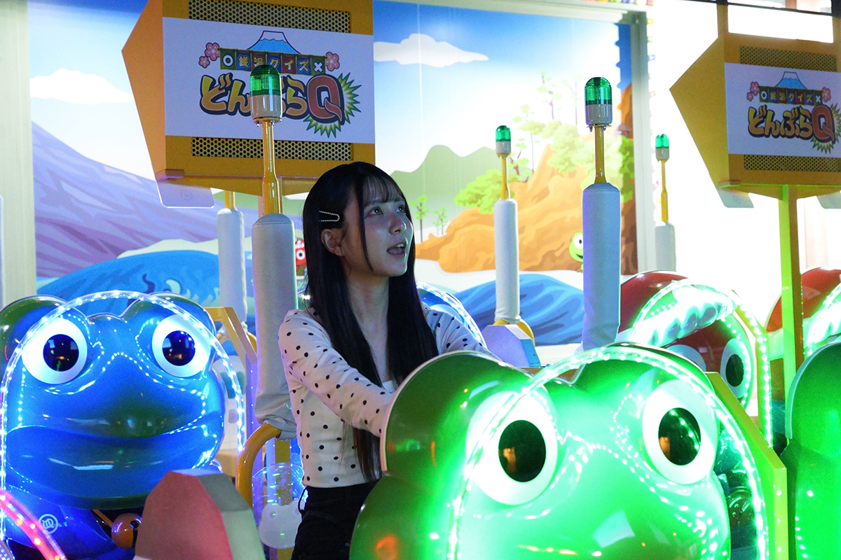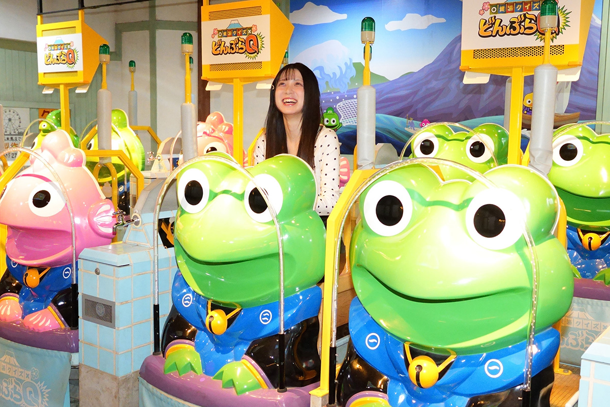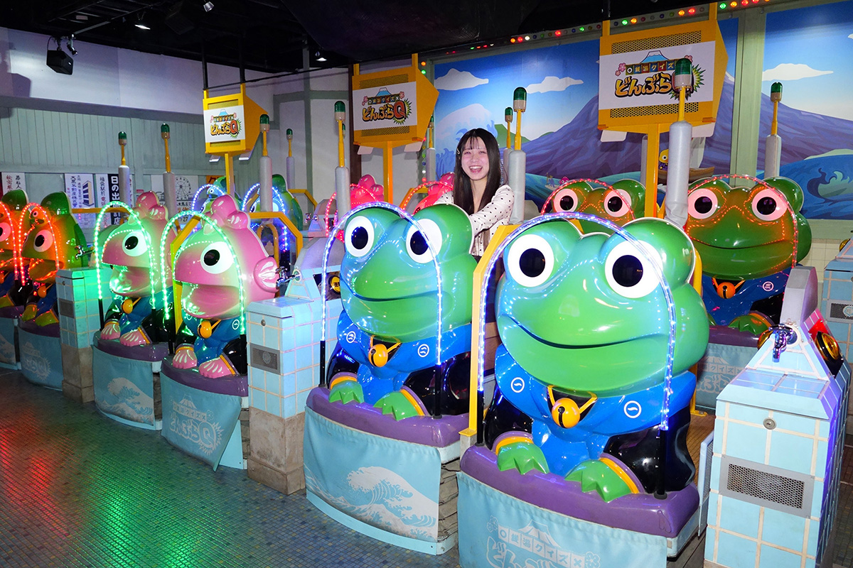 銭湯のようなステージにズラリと並んだ、かえるやたこ、ひよこなどのライド(乗り物)に乗って頭脳クイズに挑戦します。クイズ中はゆらゆら揺れたり、カラフルな電光で演出されたりと、まるでテレビ番組に出演しているかのよう。お友達や家族で挑戦すれば、盛り上がることまちがいなし! 勝敗のポイントになるのが、各プレイヤーが1度だけ使える「逆転ボタン」。回答前に押すことで、正解すれば得点が2倍になるので、自信のある問題で使うのがポイントですよ。