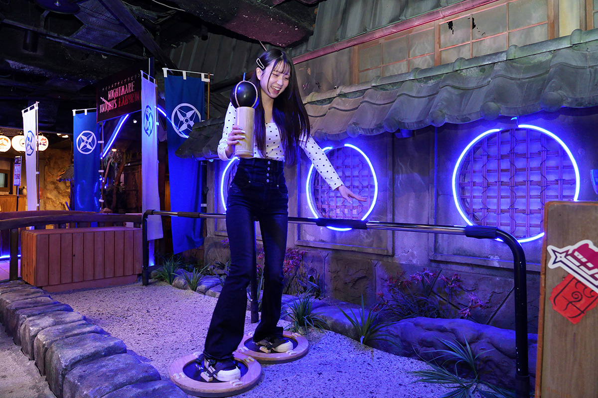 「ナンジャタウン」の一角にある、忍者たちが完全支配するエリアが「ニンジャタウン」です。ここには忍者集団「忍灯 SHINO-BI(シノビ)」の「ニンジャ訓練所」があり、手裏剣や弓、隠れ身の術などを体験することができ、成功条件を達成することで、証となる「忍灯ステッカー」が1枚もらえます。さらにクイズアトラクションの「忍灯 SHINO-BI 養成試験 ~科学NINJAアカデミー~」では、忍灯になるための試験を受けることも可能! あなたは忍灯の一員になることができるかな?