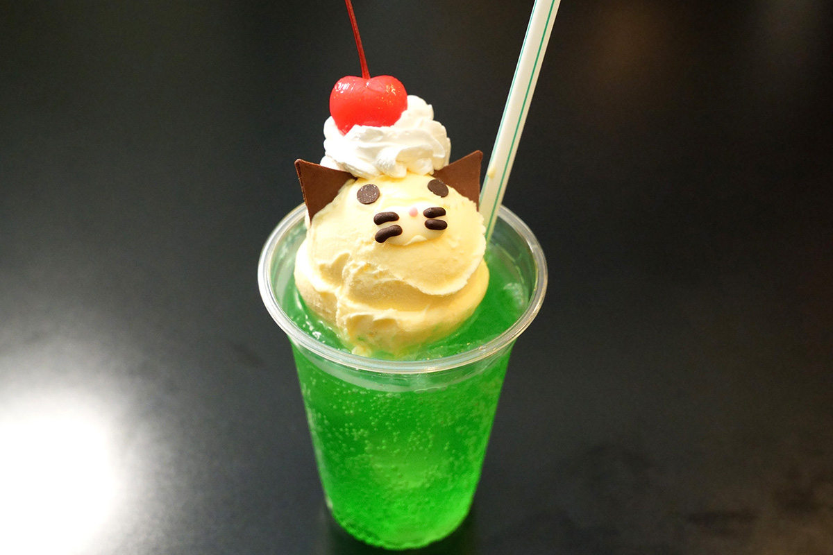 にゃんこ型のアイスが特徴の「ミッケ☆アイスクリーム-miquette icecream-」の「ミッケ☆フロート(750円)」。