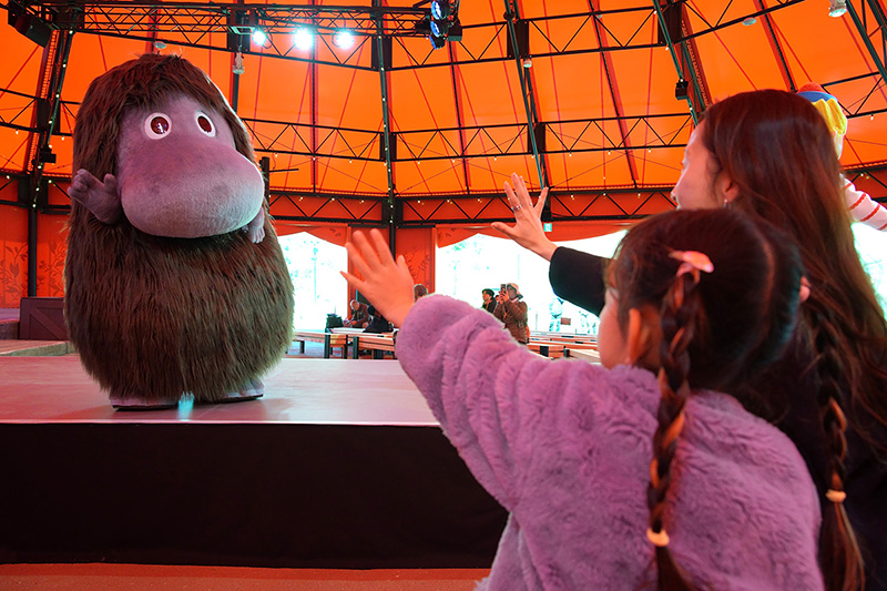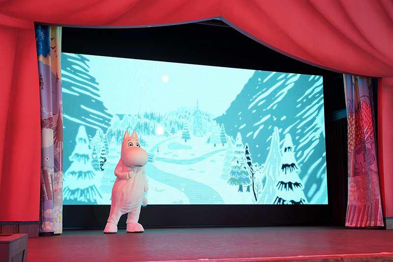 『ムーミン』の原作ストーリーをベースとしたショーを開催していた「エンマの劇場」が、これまでの屋外劇場形式から全高約10メートルの大型テントを備えた全天候型シアターに生まれ変わりました。さらに高さ4メートル幅7メートルの大型LEDスクリーンや立体音響&最新の照明システムを配することで、物語への没入感がよりいっそうアップ!