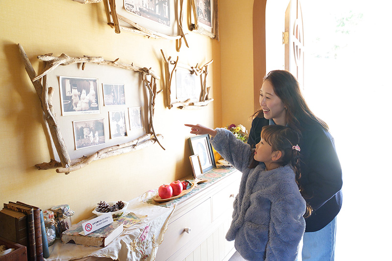 ダイニングの壁にはムーミン一家の記念写真がいっぱい! 屋敷内のどこかに、ムーミンのレントゲン写真(!)もあります。