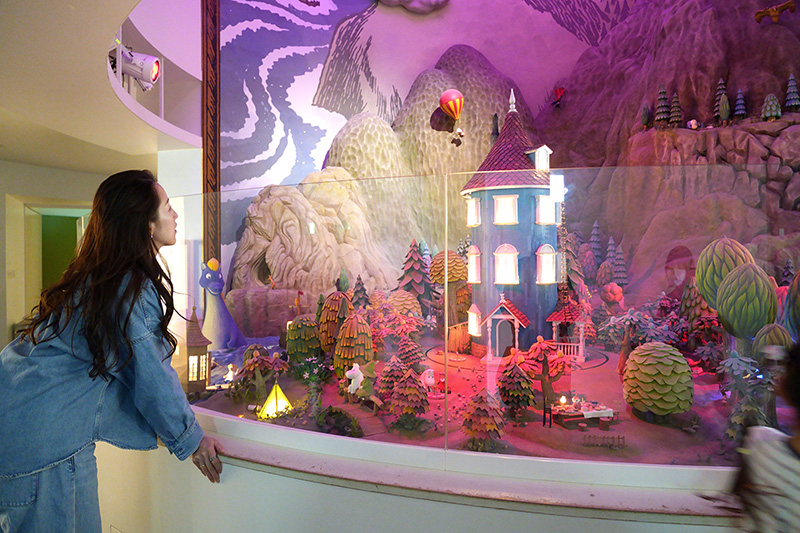2階と3階の吹き抜け部分には、高さ約8メートルの巨大なムーミン谷のジオラマが。光とナレーションで様々な物語を演出。