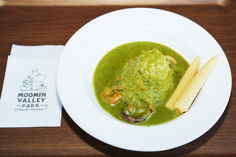「スナフキンの帽子カレー」(単品1680円)は、ほうれん草のペーストを使った辛さ控えめなシーフードカレー。